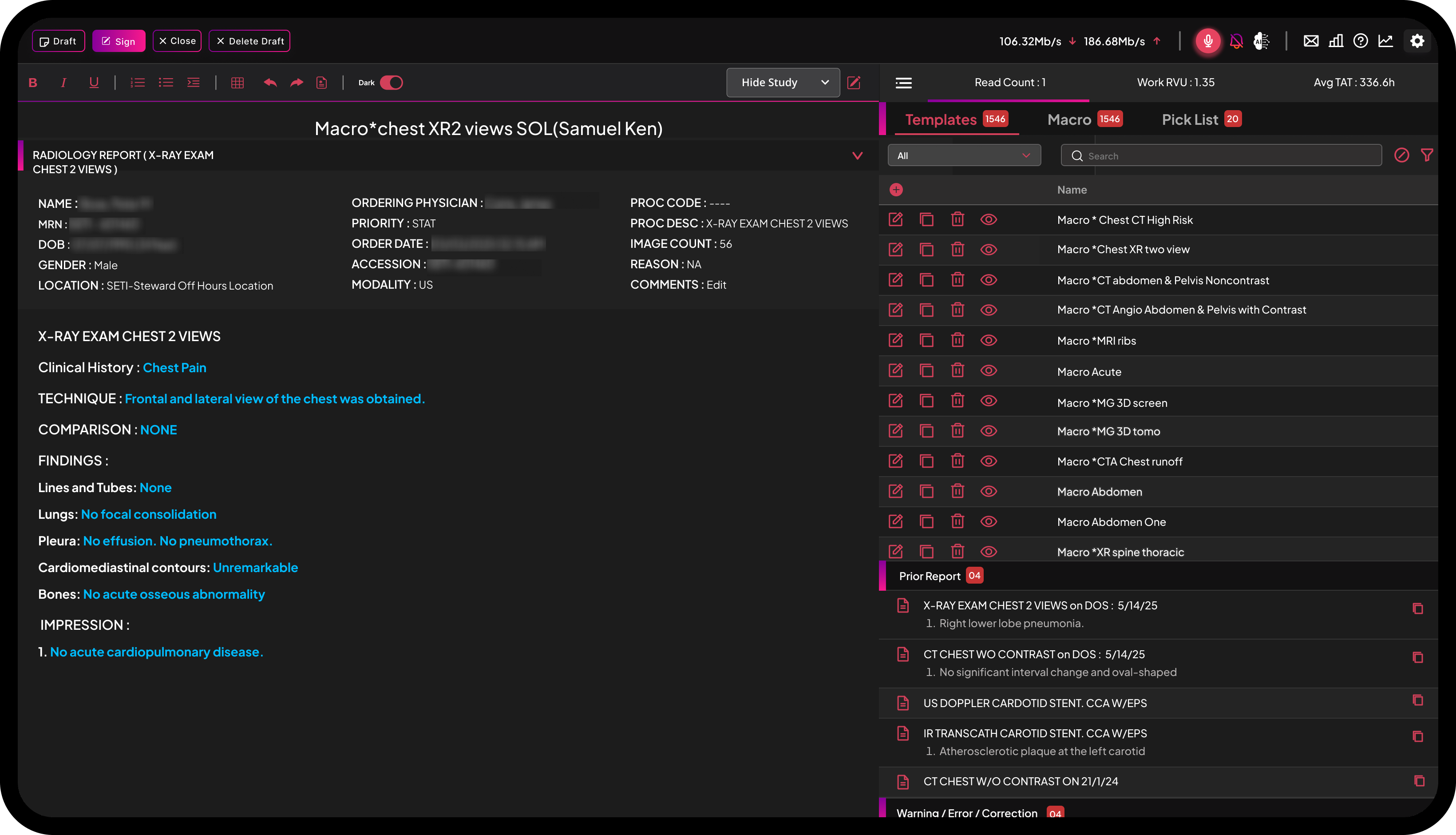 Dictate reports with speed and accuracy using real-time voice-to-text conversion, fully integrated into your radiology workflow.