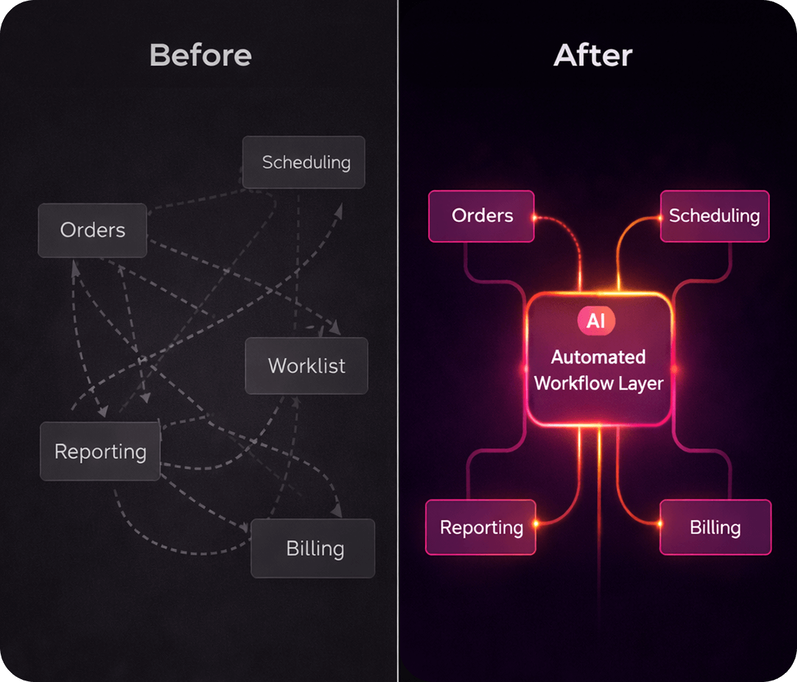 Radiology practices are under constant pressure to keep up with new requirements, shifting payer rules, and evolving patient expectations. Manual processes slow teams down, while disconnected systems make it difficult for schedulers, technologists, radiologists, and billing professionals to work in sync. Without automation, tasks like routing, follow-up, eligibility checks, report distribution, and workload balancing become inconsistent and time-consuming, reducing efficiency and increasing operational costs.